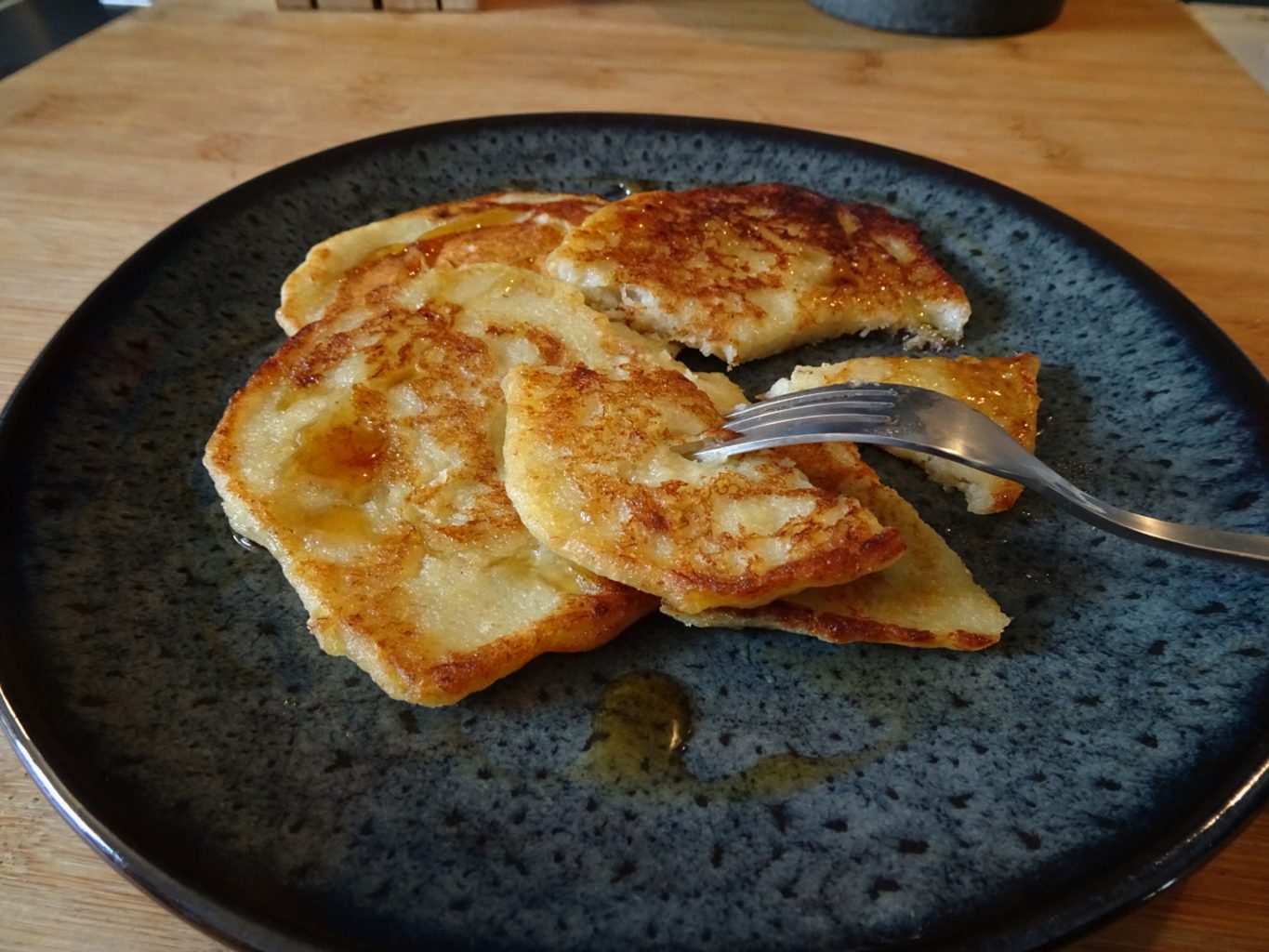 - Den Teig in die Pfanne geben und etwa 3 kleine Pancakes formen.
