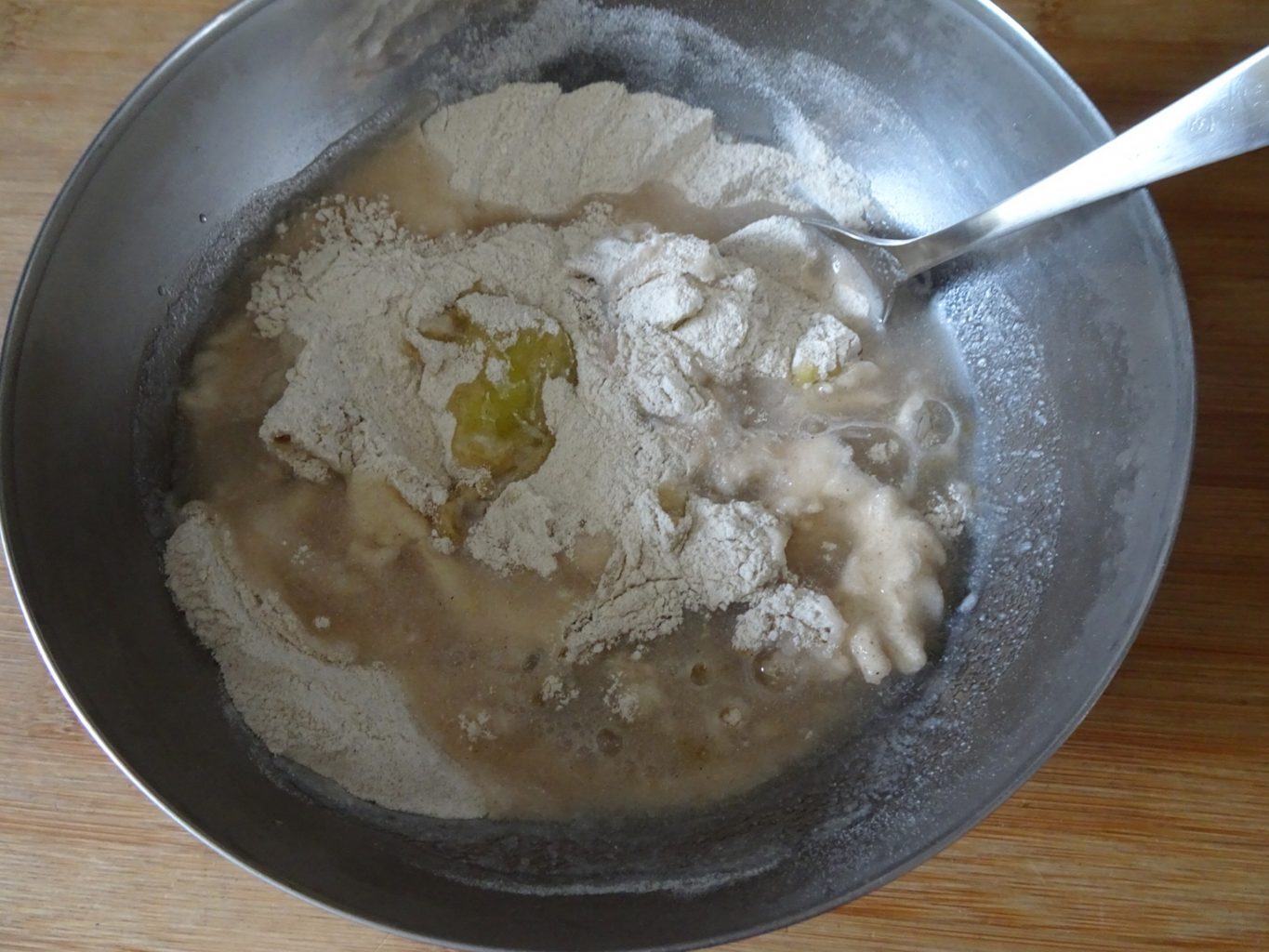 - Mix the flour and salt together, add the oil and boiling water, mix with a spoon.