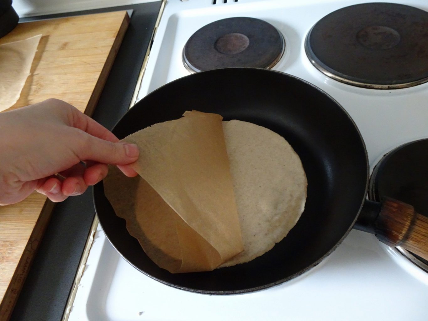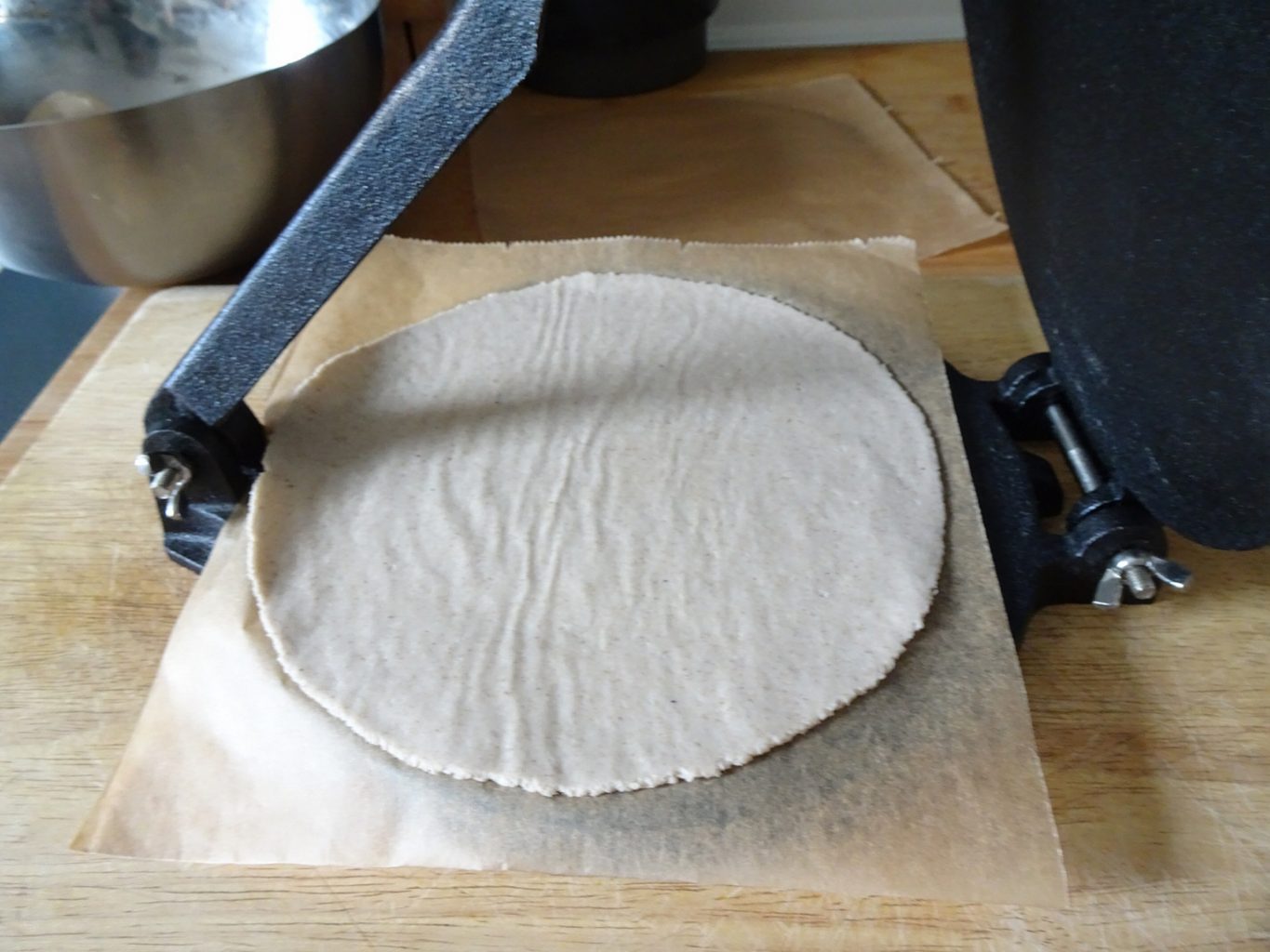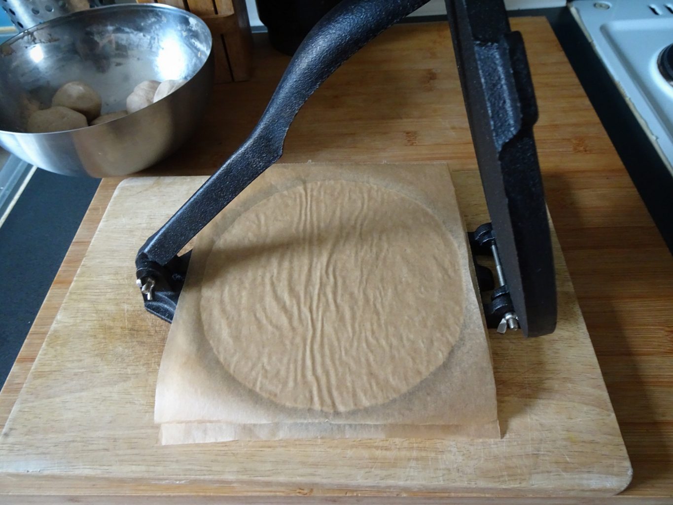 - Press the balls with a tortilla press, make sure to use two sheets of parchment paper.
