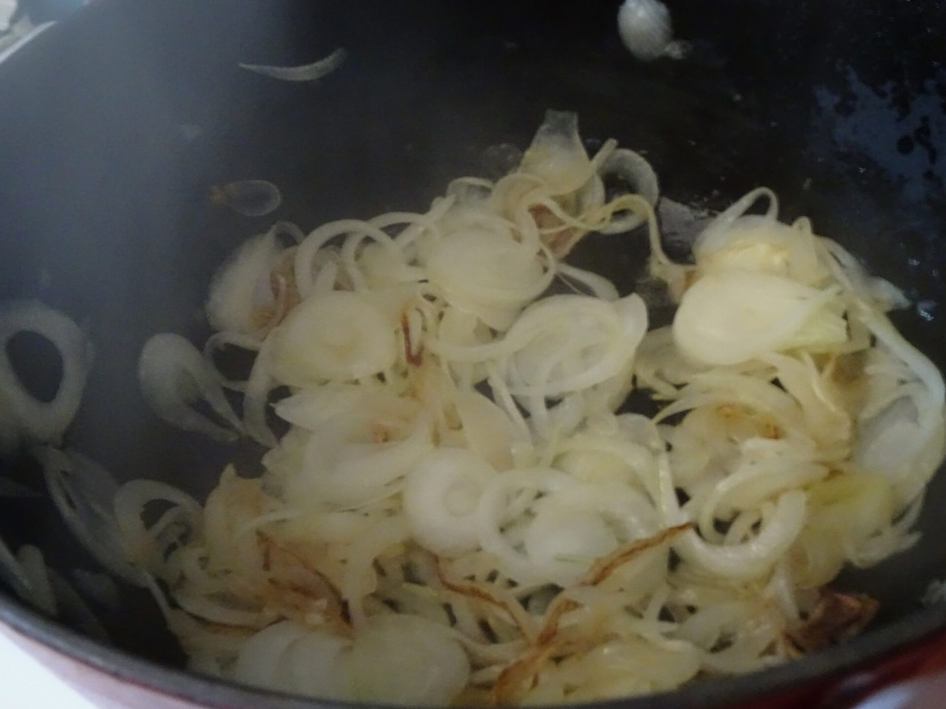- Heat the oil in a saucepan, add the cumin, then mince the onion and add aswell.