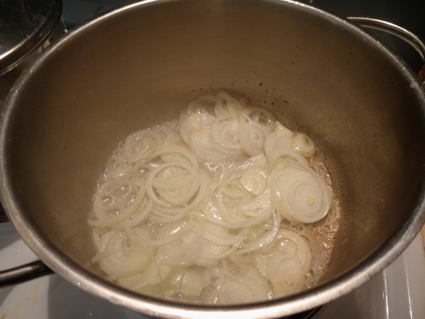 - Das Öl in einem Topf erhitzen, die Zwiebel klein schneiden und in das erhitzte Öl geben.