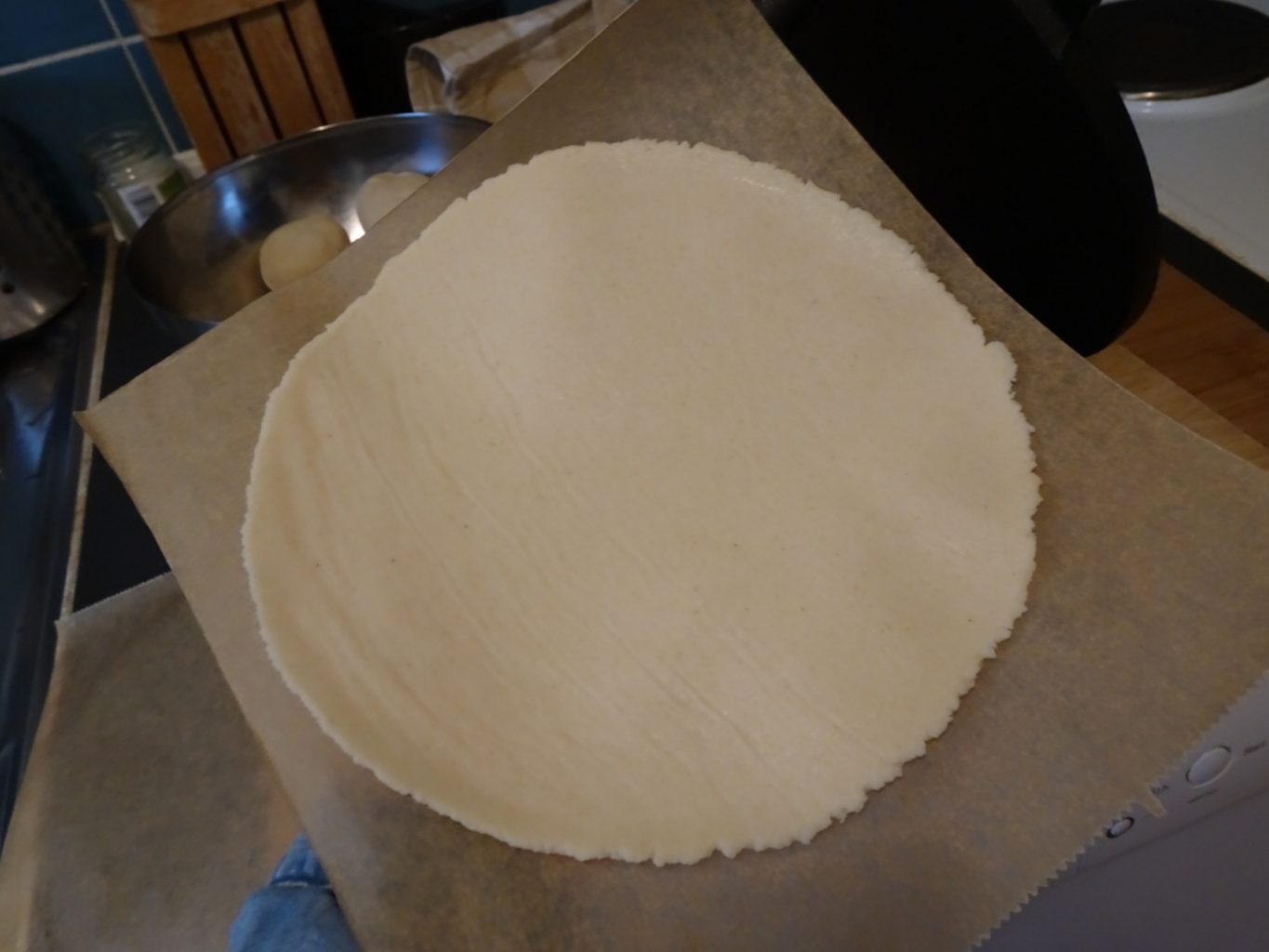 - Die Teigkugeln mit einer Tortillapresse platt drücken, dabei zwei Stücke Backpapier verwenden.