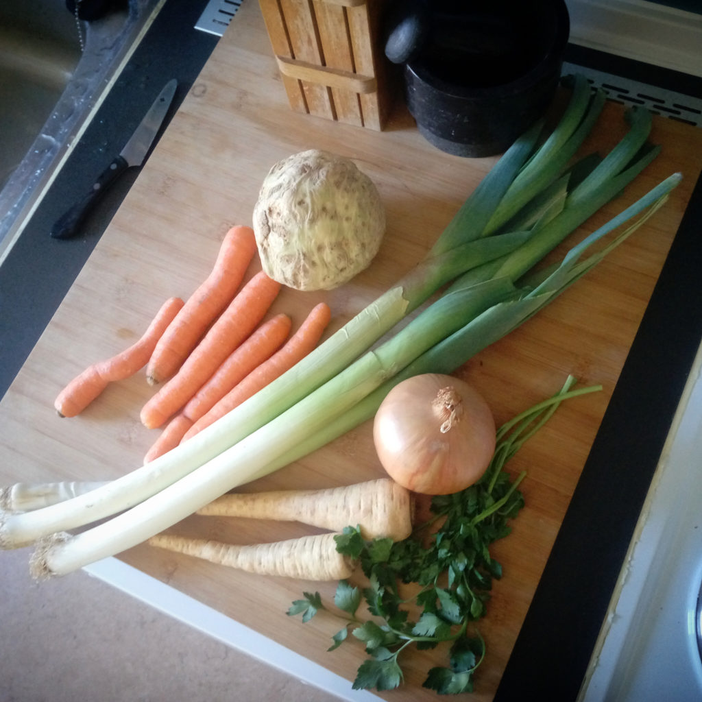 • Das Gemüse waschen, die Zwiebeln und den Knoblauch schälen.