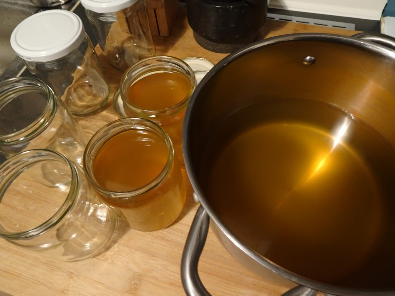 • Nach vier Stunden den Herd ausschalten und die Brühe ein paar Stunden ruhen lassen.