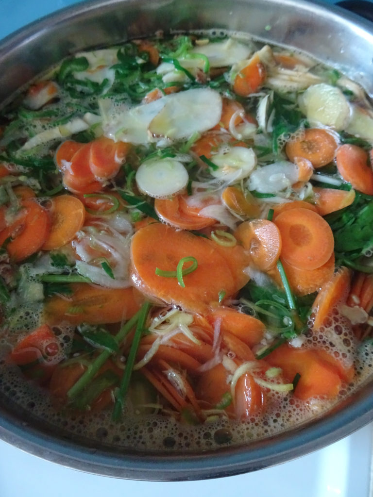 • Das Gemüse klein schneiden und in einen großen Topf geben.